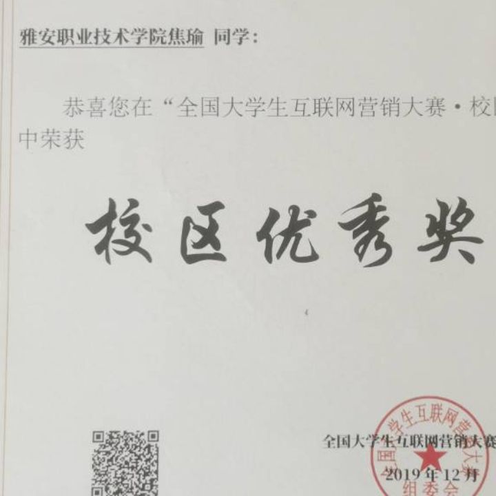- 在校期间参加各种社团活动,还担任了爱跑协会的宣传部部长,在2020年暑假社会实践活动中荣获三等奖,“全国大学生互联网营销大赛校区赛”中荣获校区优秀奖。