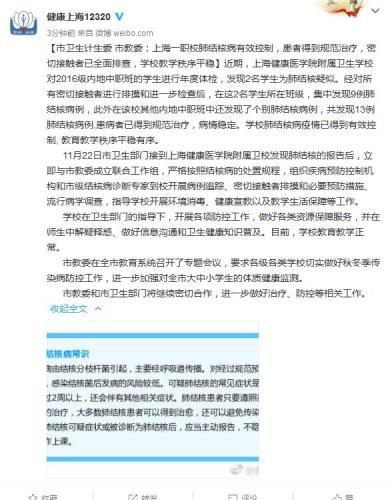 通报指出,11月22日上海市卫生部门接到上海健康医学院附属卫校发现肺结核的报告后,立即与市教委成立联合工作组,严格按照结核病的处置规程,组织疾病预防控制机构和市级结核病诊断专家到校开展病例追踪、密切接触者排摸和必要预防措施、流行病学调查,指导学校开展环境消毒、健康宣教以及教学生活保障等工作。